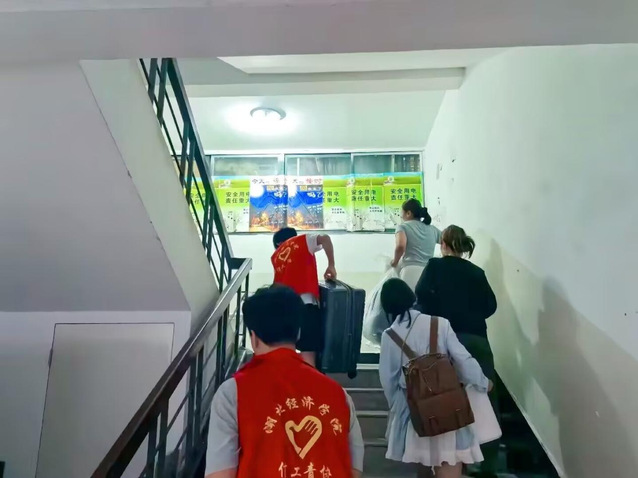 迎新现场,志愿者们每当看到新生拖着沉重的行李箱走来,便主动接过行囊,往返于宿舍各楼层之间。他们耐心地引导新生到指定区域办理入住,细致地解答新生的每一个问题,让校园的第一缕暖意沁入新生心田。在下午学院举办的新生家长见面会上,志愿者提前抵达会场,协助完成会场的布置,为见面会的顺利开展做好了充分准备。在会议期间,志愿者们实时关注现场状况,为有需求的家长提供帮助,用最真诚的服务搭建起学校与家长之间的信任桥梁。
