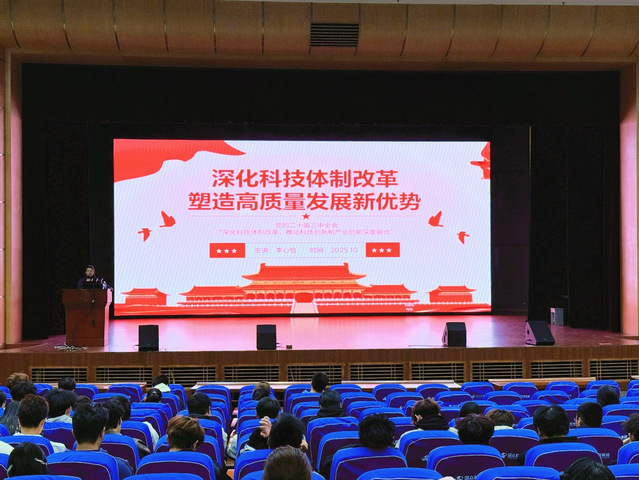 图为李心怡老师带领大家学习深化科技体制改革相关内容